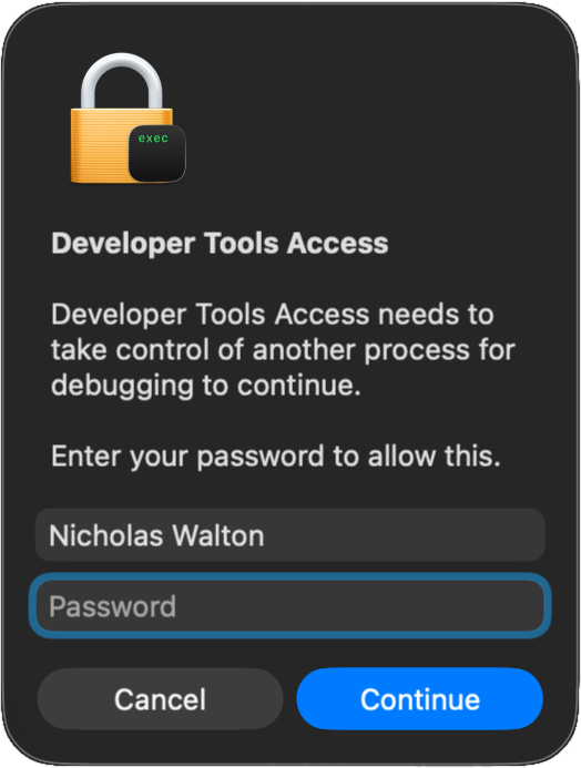 With that set up, you should be able to press F5 to debug (or press the green play button in the debug sidebar). You should see your build task command get run, building your program, then lldb will launch, fully integrated with vscode. The first time, you'll get a prompt for permissions: